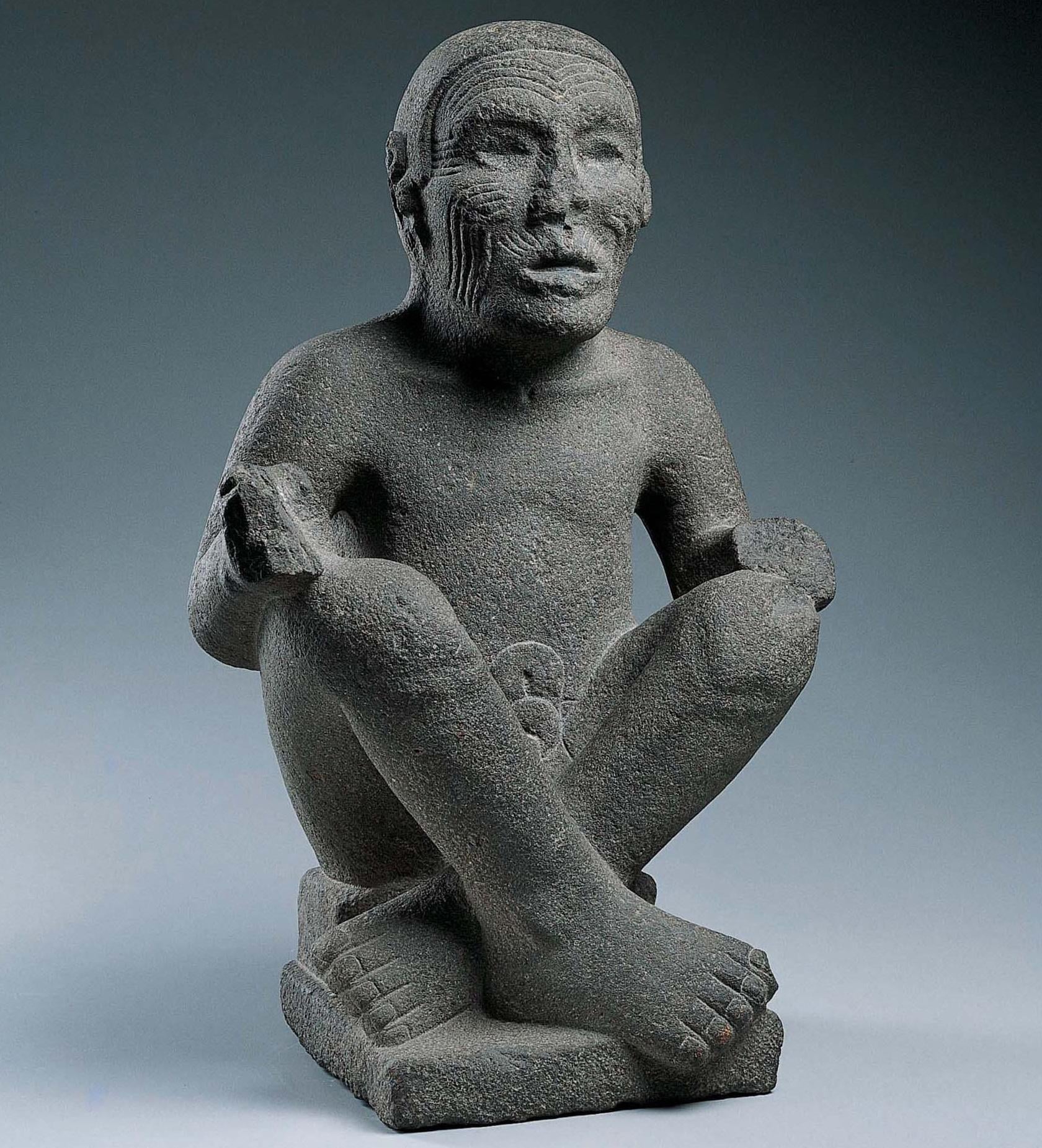 [Museum](https://artsandculture.google.com/asset/seated-man-possibly-huehueteotl/NwERpEnCyXAKXg). The Aztec pantheon included a vast number of gods who encapsulated almost every function of time and life. The Kimbell’s Seated Man was probably a local cult image and may have served as a guardian figure for the stairway of an Aztec temple platform. On ceremonial occasions he may have held a banner staff in his right hand and perhaps wore a special costume. His sturdy body and coarse features indicate that he is an old macehualli, or man of the people. The bold facial scarification and more subtle, abstract patterns on the kneecaps, shoulder blades, and vertebrae suggest that he also represents the “Old God,” Huehueteotl, the Aztec patron of fire, and lord of the center of the Universe. At its most successful, Aztec sculptures, such as this, have a striking and monumental directness that sets them apart from their Maya and other Mesoamerican predecessors.