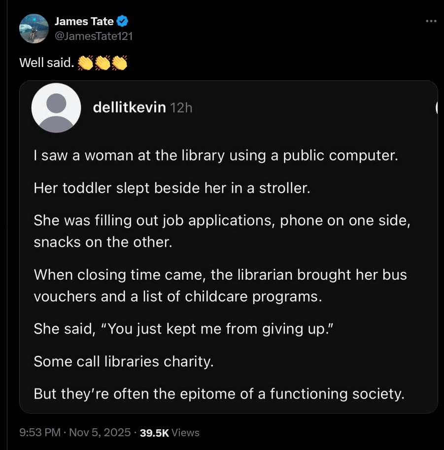 In fiction, I keep seeing these joint community centers and libraries that are like the best place to go in town for free and just…experience humanity and get needed help. If every town had something like that, it would make the world such a better place. Rather than call them ‘woke’ and try to shut them down.