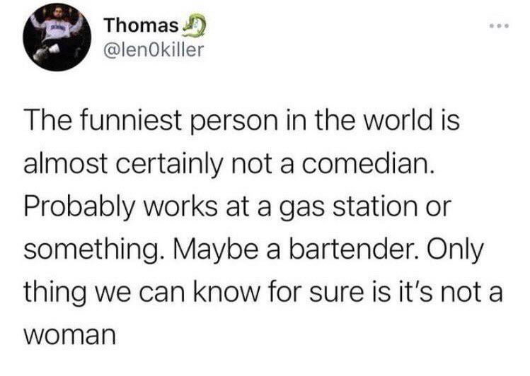 Not true. Woman can be hilarious when they’re not trying to be. If you have sisters then you know. They do the dumbest shit.