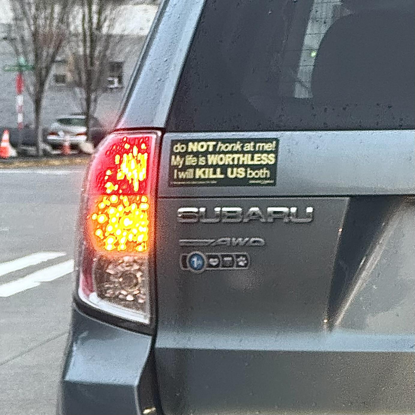 I saw one the other day that said “dont honk at me my mom is dead”. It was so damn weird lol. Unless there’s a reference i’m not getting.