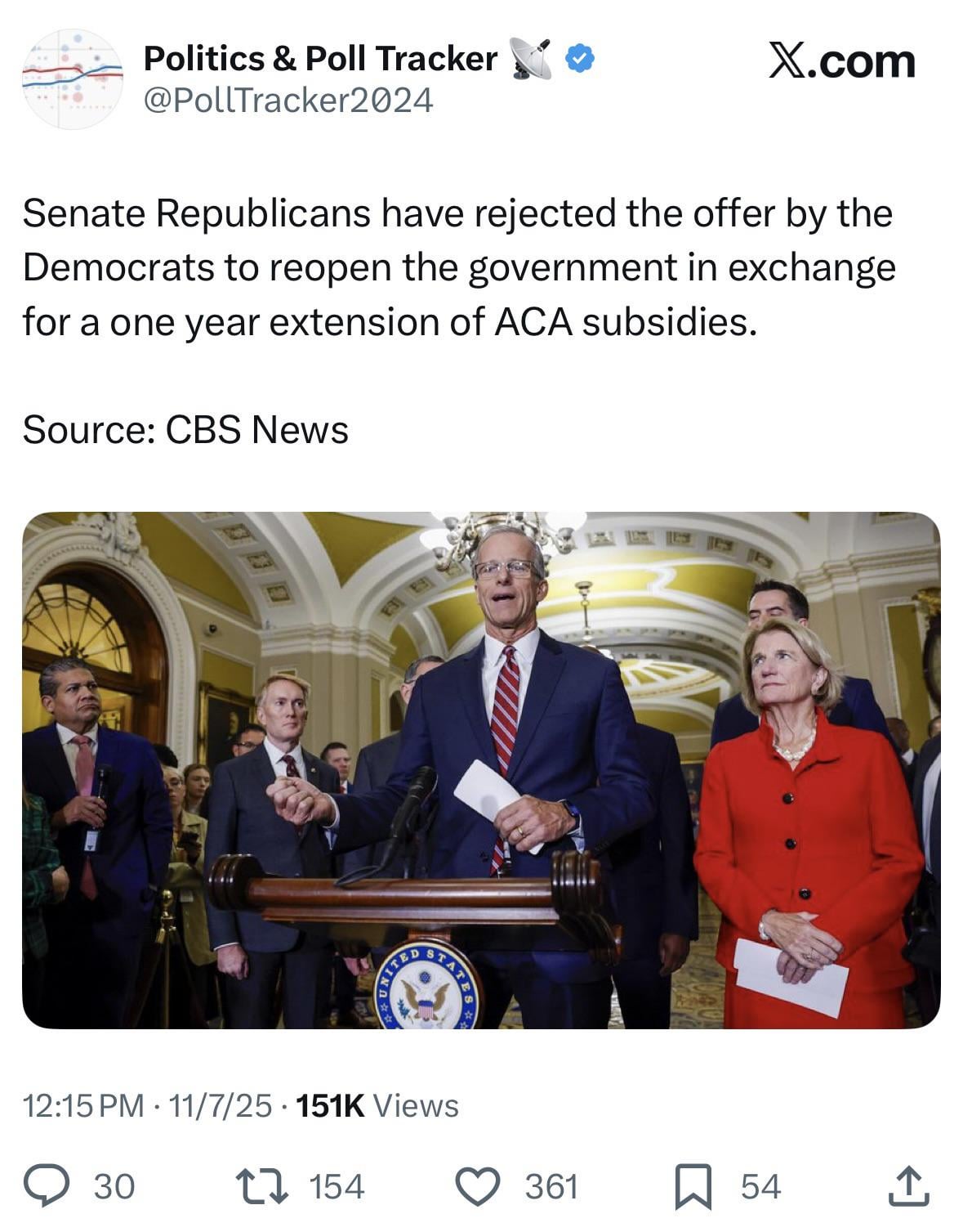The price for Democratic votes to end the shutdown should go up. 1 year ACA extension, full funding for remaining IRA programs, release the Epstein files.