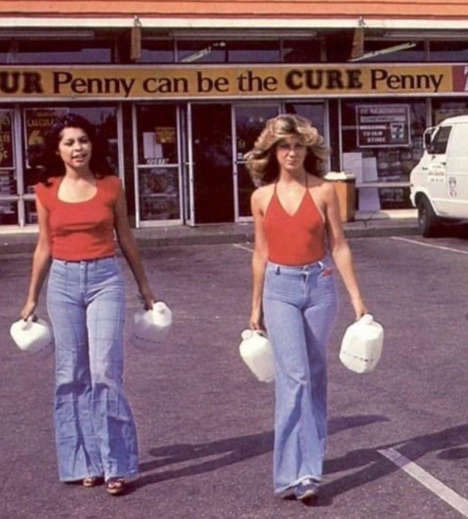 Those jeans are definitely back now, but both beats that original 70s vibe. The Farrah hair is just iconic