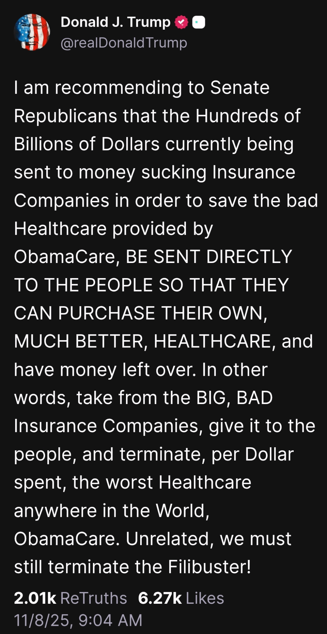 Notice president fuckface doesn’t address the massive rise in premiums coming. He literally wants the government to just burn. He won’t do anything that he can’t spin as a “win” for him.