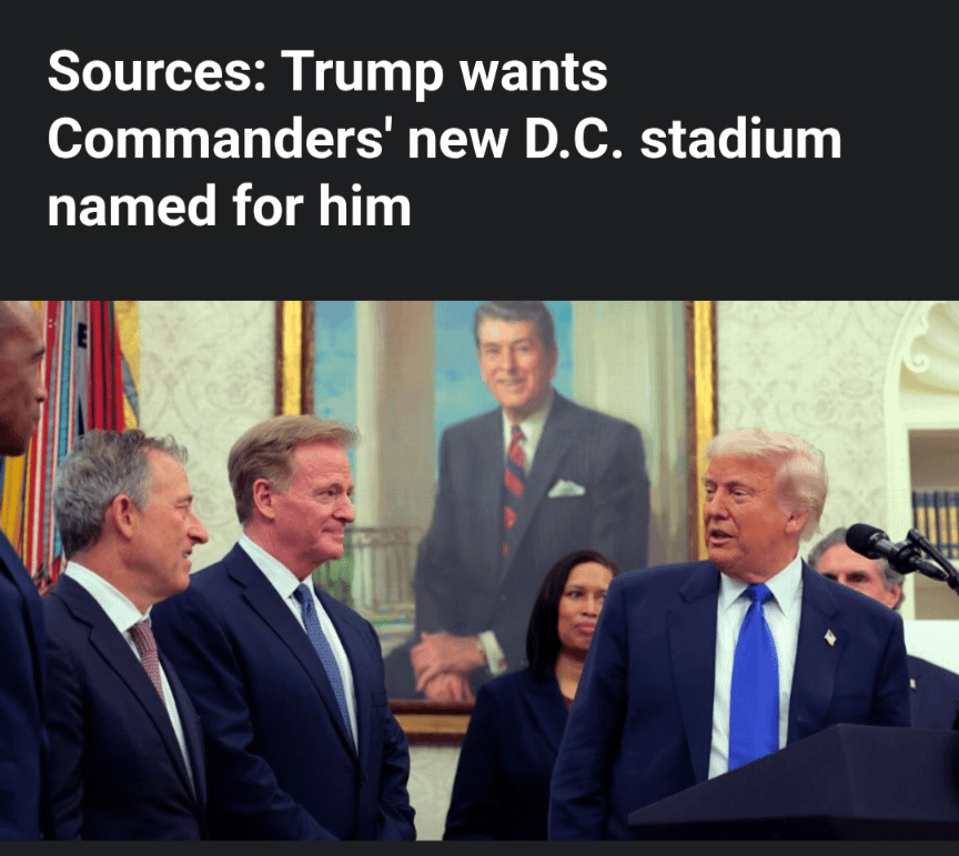 Wants the Washington Commanders new stadium named after him and wants the team name to go back to it’s original. Let’s compromise and name the team The Washington Orangeskins.