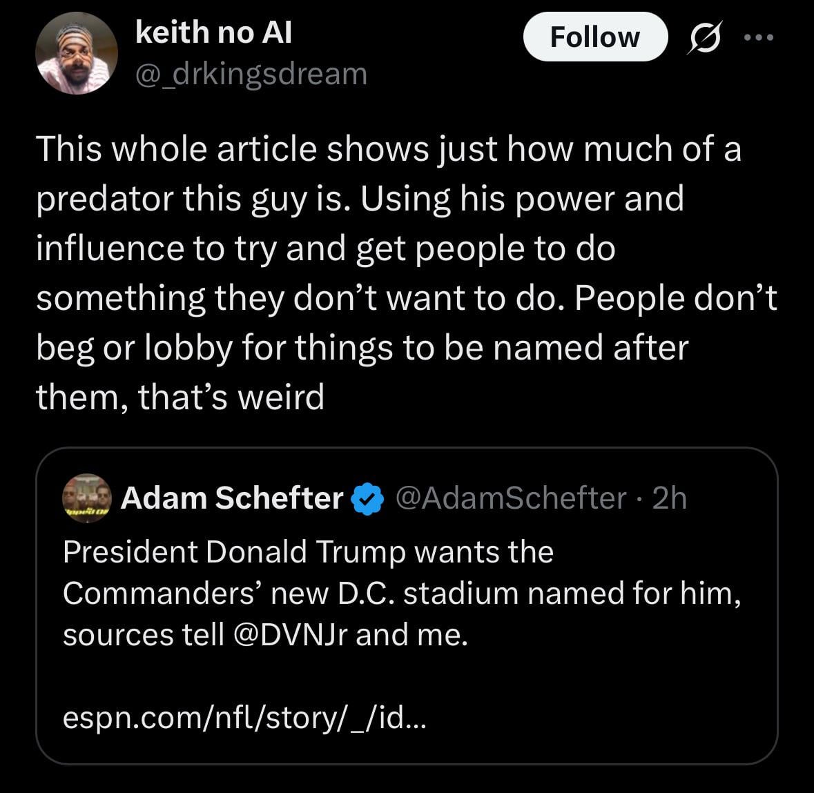 And no, this [is not a joke. He’s dead fucking serious](https://www.espn.com/nfl/story/_/id/46892115/trump-wants-commanders-stadium-named-him)