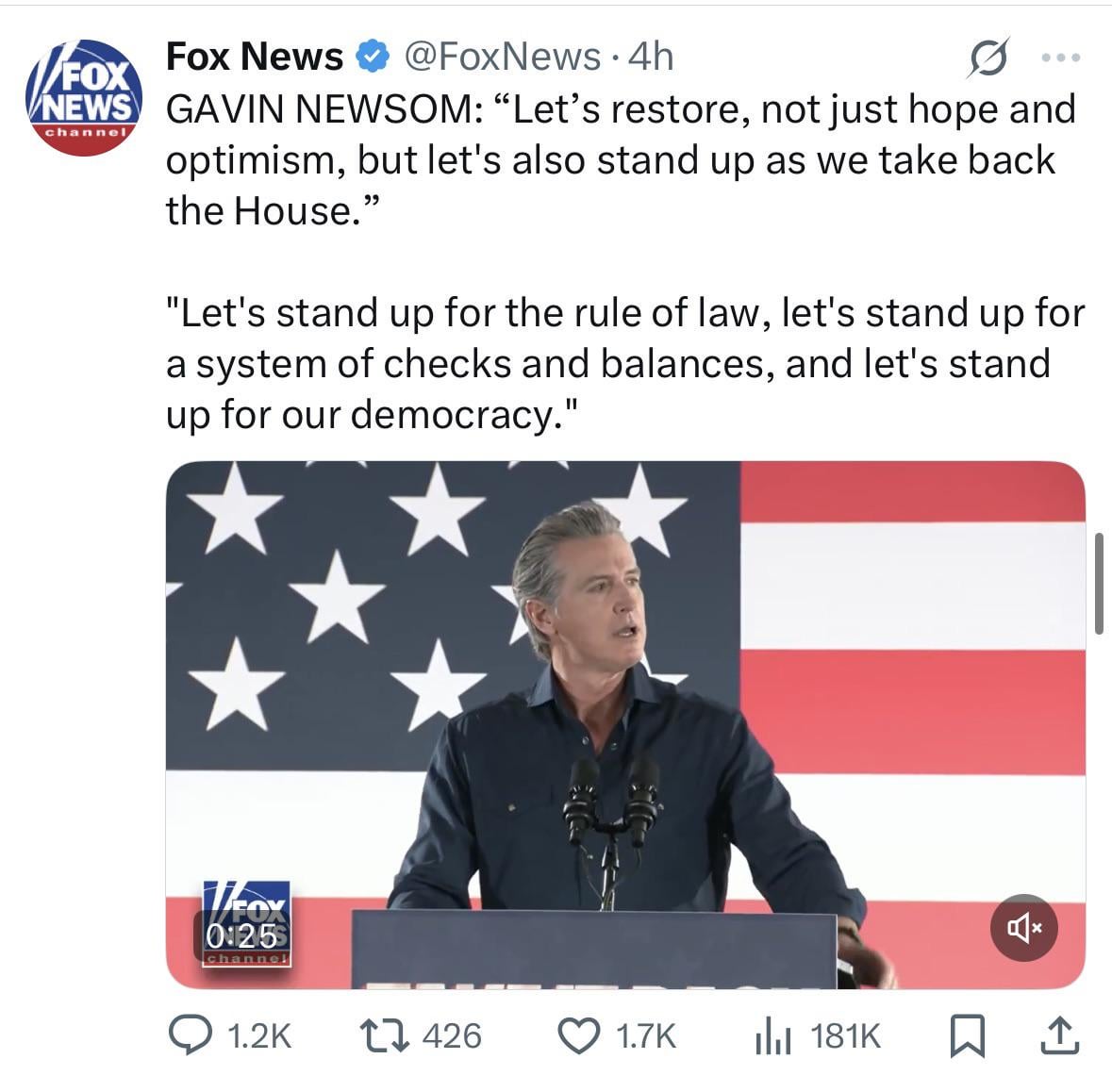 Gavin is also very pro-business, so if Fox is going to pick any Democrat, it’s going to be him. Trump is for removing all the guard rails and restrictions, guardrails and restrictions that will be very difficult (if not impossible) to rebuild if we ever manage to remove MAGA from power. So why not start pushing for a pro-business Dem who will be more likely (than someone like AOC) to champion a corporate bailout to restart the American economy?