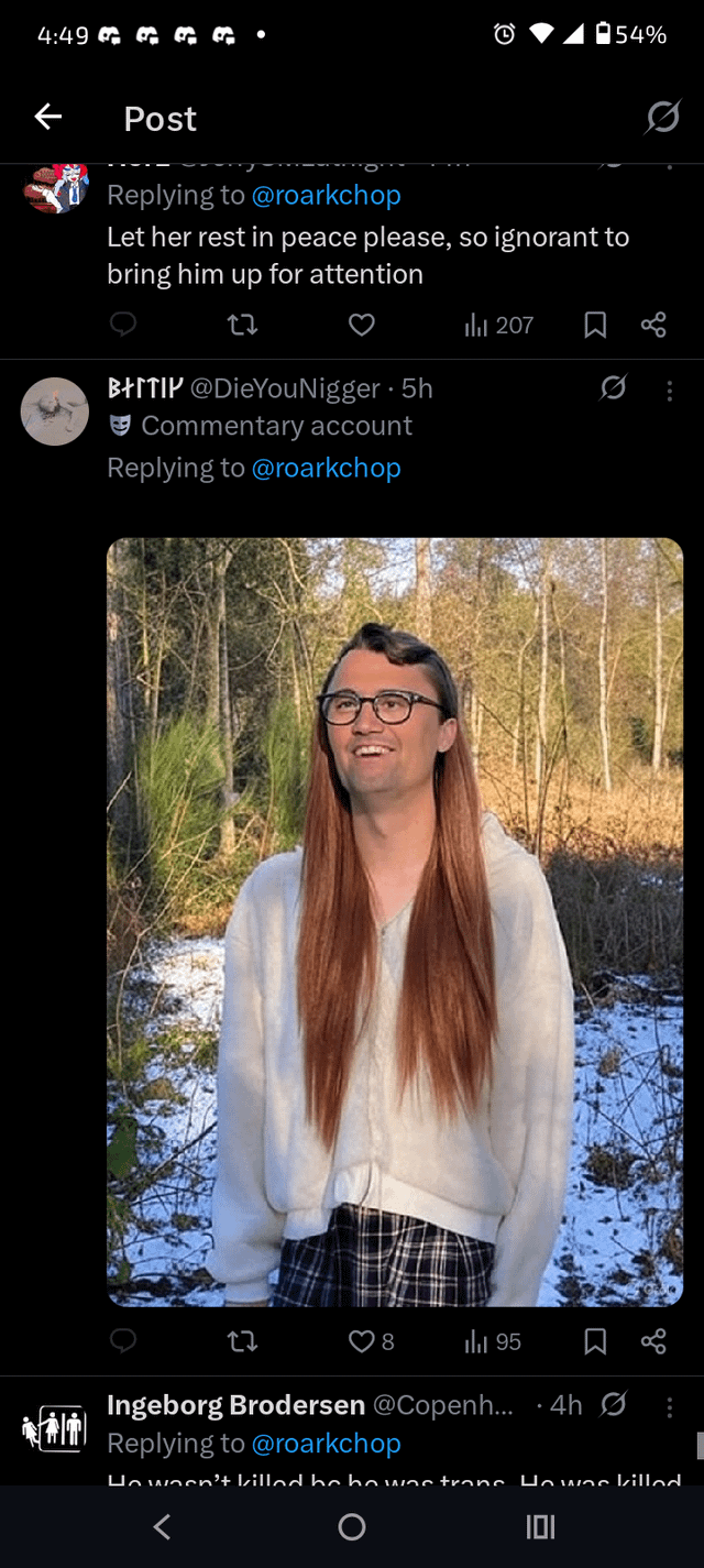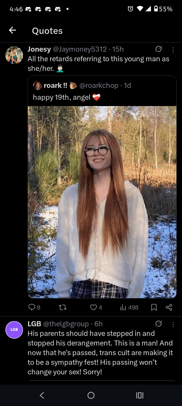 FYI, she didn’t die by suicide like several of the tweets suggest, she was stabbed to death in a park for being trans, then the UK prime minister went on to make a horrible transphobic statement while her grieving mother was present in the room.