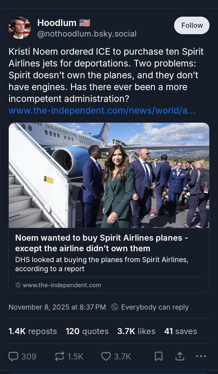 I guess Noem want to buy Spirit Airlines aircraft, because just like ICE, Spirit also has a long history of making people suffer