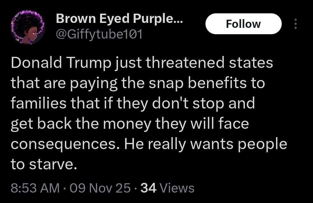 he doesn’t care about SNAP or who it hurts one way or the other. It’s just a cynical ploy to put pressure on Dems to cave and reopen the government. Because you just know he’s going to yell and scream on Truth Social how it’s actually the democrats blocking SNAP benefits. It’s such obvious BS, but his cultists will eat it up