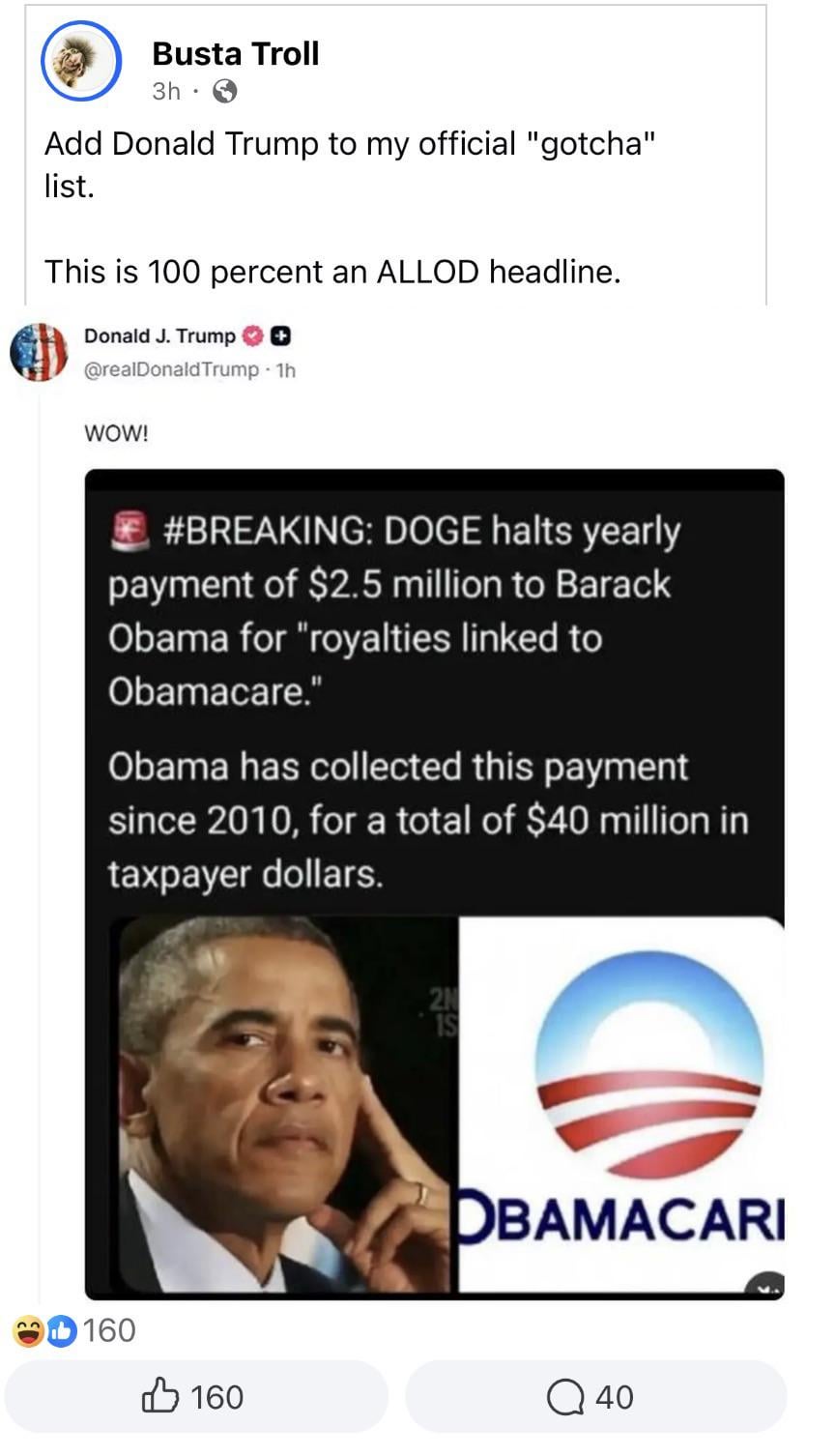 Here’s a link to the satire story. https://dunning-kruger-times.com/doge-halts-2-6-million-annual-payment-to-obama-for-obamacare-royalties/