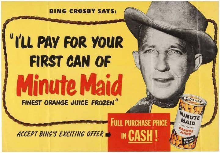 1950s in store advertisement for Minute Maid Frozen Orange Juice! Bing Crosby offers to buy your first can for you! by AxlCobainVedder