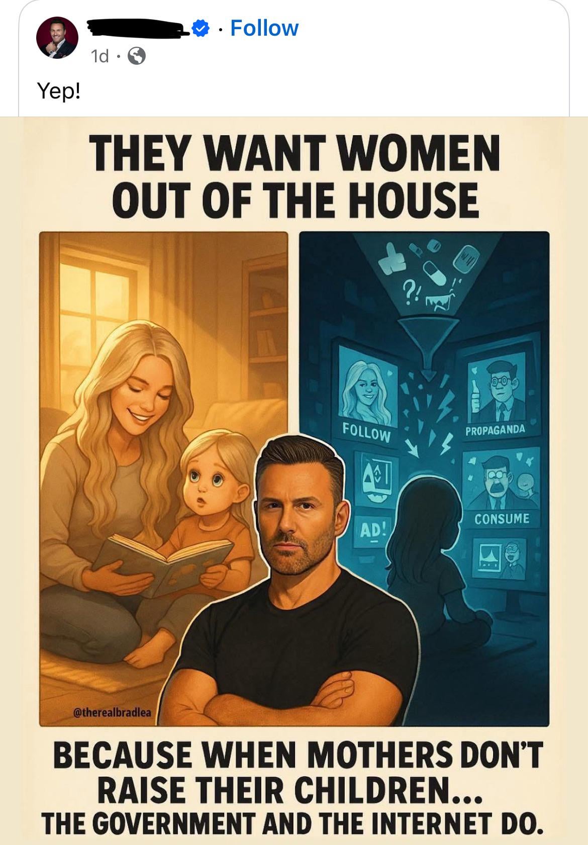 The distillation of MAGA manhood: “Childcare is the shittiest, most demeaning form of labor on Earth, so we need an entire caste of domestic slaves, like literally half of humanity, or else the Gummint will force me, ME, to take part.”