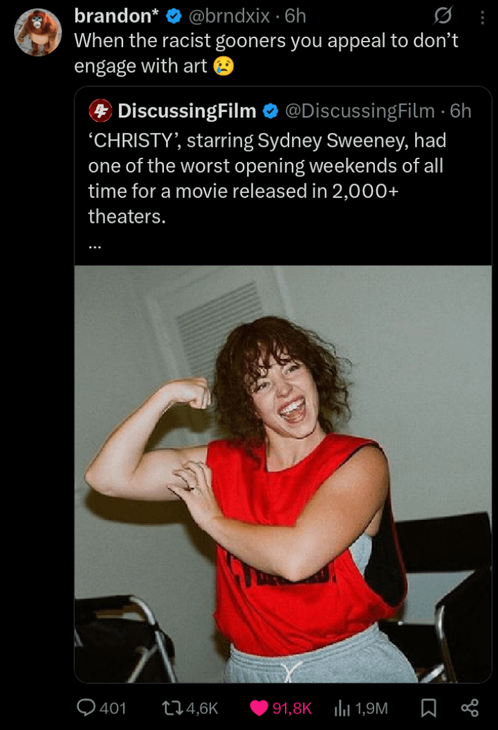 4. Granted the movie had terrible marketing. Ive never heard of it until today no lie. But it is funny how Sweeney has marketed herself as the “everyday girl with big tits”, and then people wanna act surprised when the general base of people who would support that alone don’t support this type of movie. She’s put herself into a box. You’re not going to become a serious actress with serious movie roles anytime soon and that’s her own fault really.