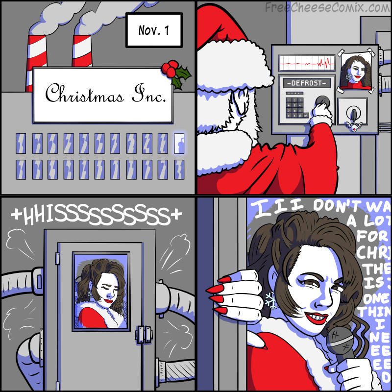 Absolutely zero idea what’s going on in this comic, aside from the obvious ‘Santa sets loose some singer on nondescript factory’.