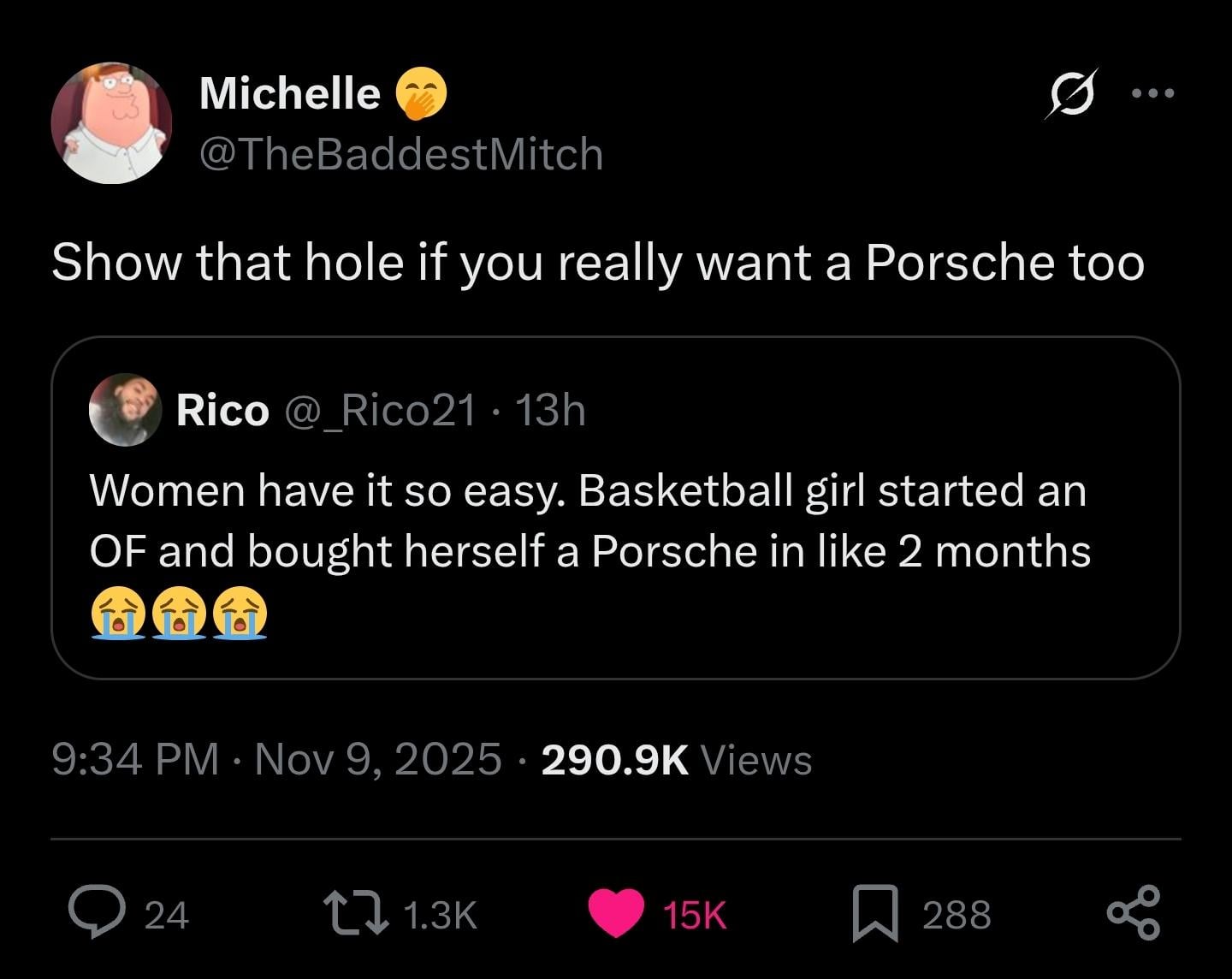 1. Men don’t realize that women have it ‘ so easy ‘ cause men saturated the market. Men will easily come to your home to provide you what u want all without demanding pay 😂 no other service in world does that