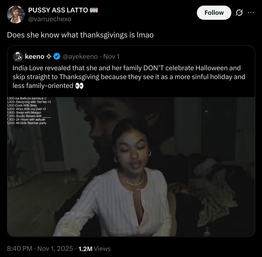 So, she doesn’t find Thanksgiving’s celebration of the whitewashing of Manifest Destiny to be sinful either? Oh, but then we are looking too far into the origins and should just think of it as a time for family to gather and celebrate in a fun and cheerful way? That would be like Halloween then…right?