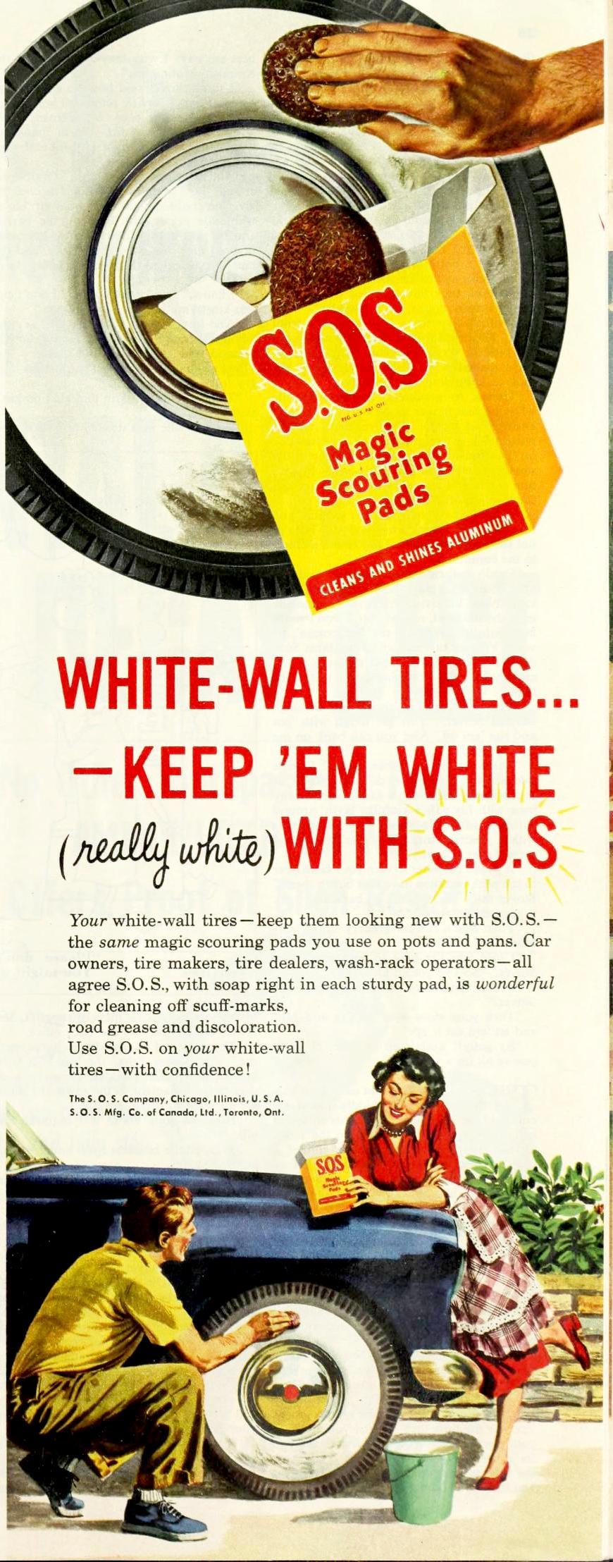 If you hadn’t posted this ad, I never would have gotten curious, looked it up, and discovered that *all tires used to be white*. They were made with natural rubber and zinc oxide (the white stuff lifeguards use as sunscreen) for improved traction. Then someone discovered that carbon black made an even better tire, but it was used only for the treads, and the rest of it remained white. Whitewalls!