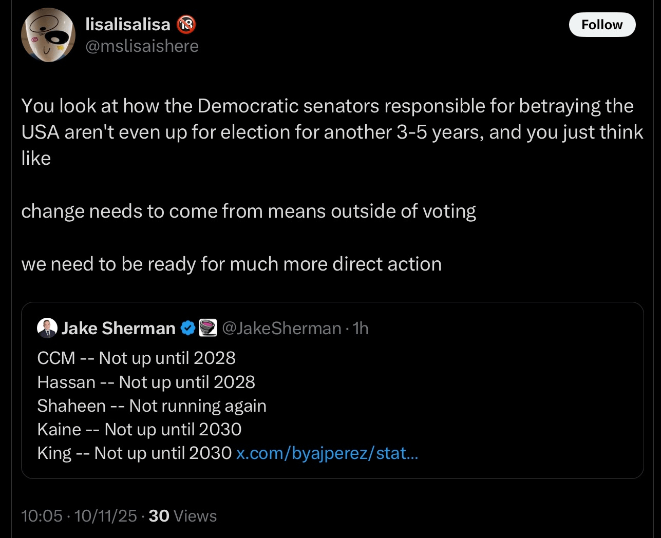 Most of the Democrats who voted to cave will not be up for a primary until 2028 or 2030. The exact amount of Democrats who caved was the exact amount they needed, and it was specifically the Democrats who were safe. This was coordinated.