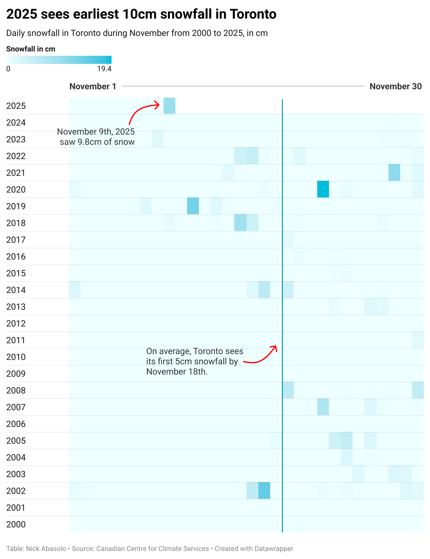 Data from the [Canadian Centre for Climate Services](https://climate-change.canada.ca/climate-data/#/daily-climate-data), visualized in Datawrapper, cleaned up and annotated [by me](https://www.nickabasolo.com/snowfall-toronto) in Figma.