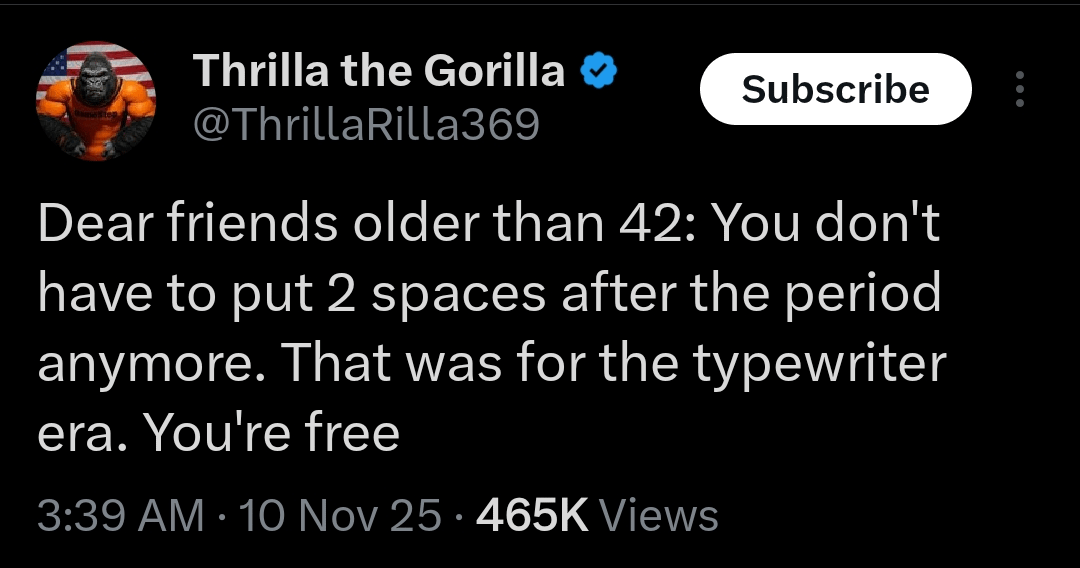 I’m a word processor for a law firm. The firm’s standard is two spaces between sentences and after colons. I am also a boomer, a young one, but still a boomer, and I took typing in high school. It’s muscle memory. I even do the two spaces in texts. I would rather use acronyms and other shortcuts than drop spaces to make texts fit the character limits.
