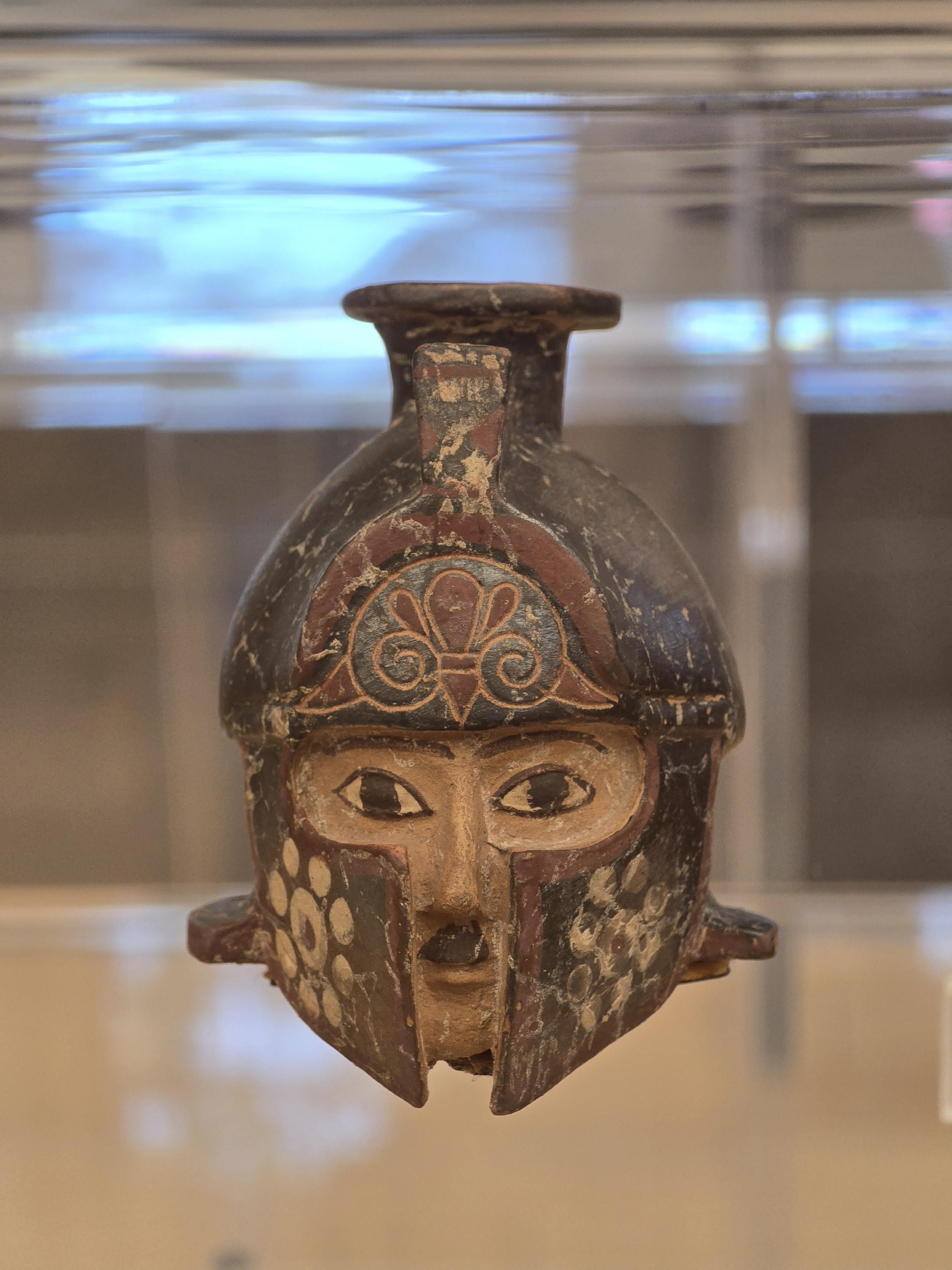 Ceramic aryballos [perfume flask] in the form of a helmeted head. East Greek, possibly Rhodian, ca. 600-570 BC. Penn Museum collection [3000×4000] [OC]