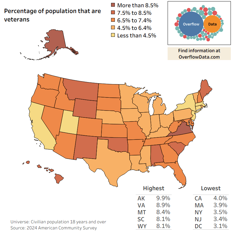 I feel like this doesn’t give you a good answer to the question in the title. Probably many more veterans live in the states with higher populations, but they’re a relatively smaller part of the population.