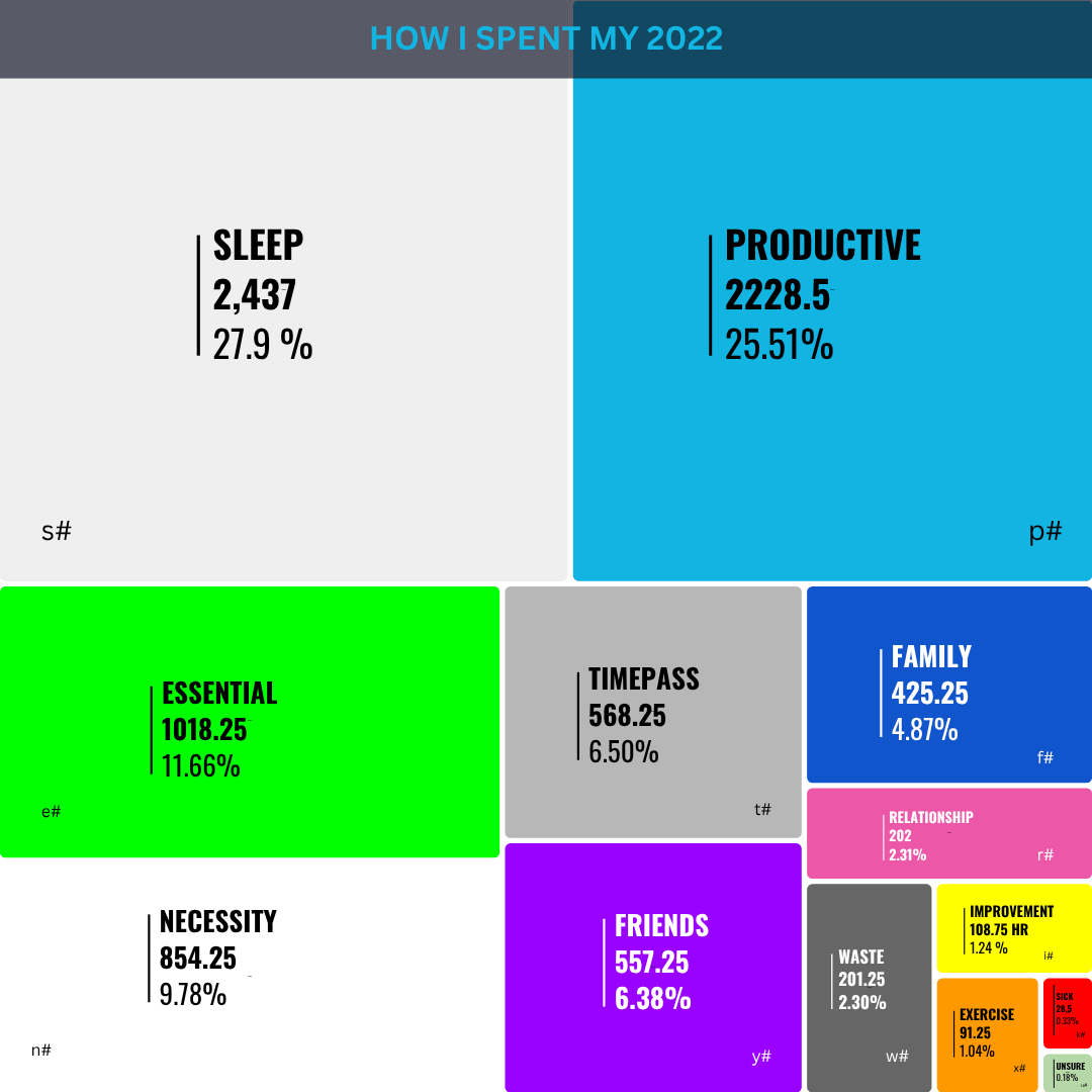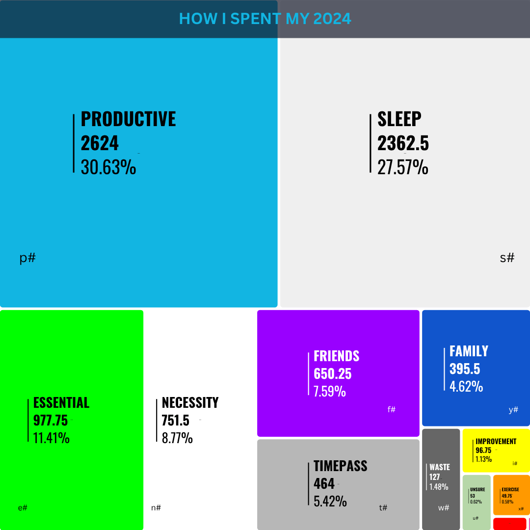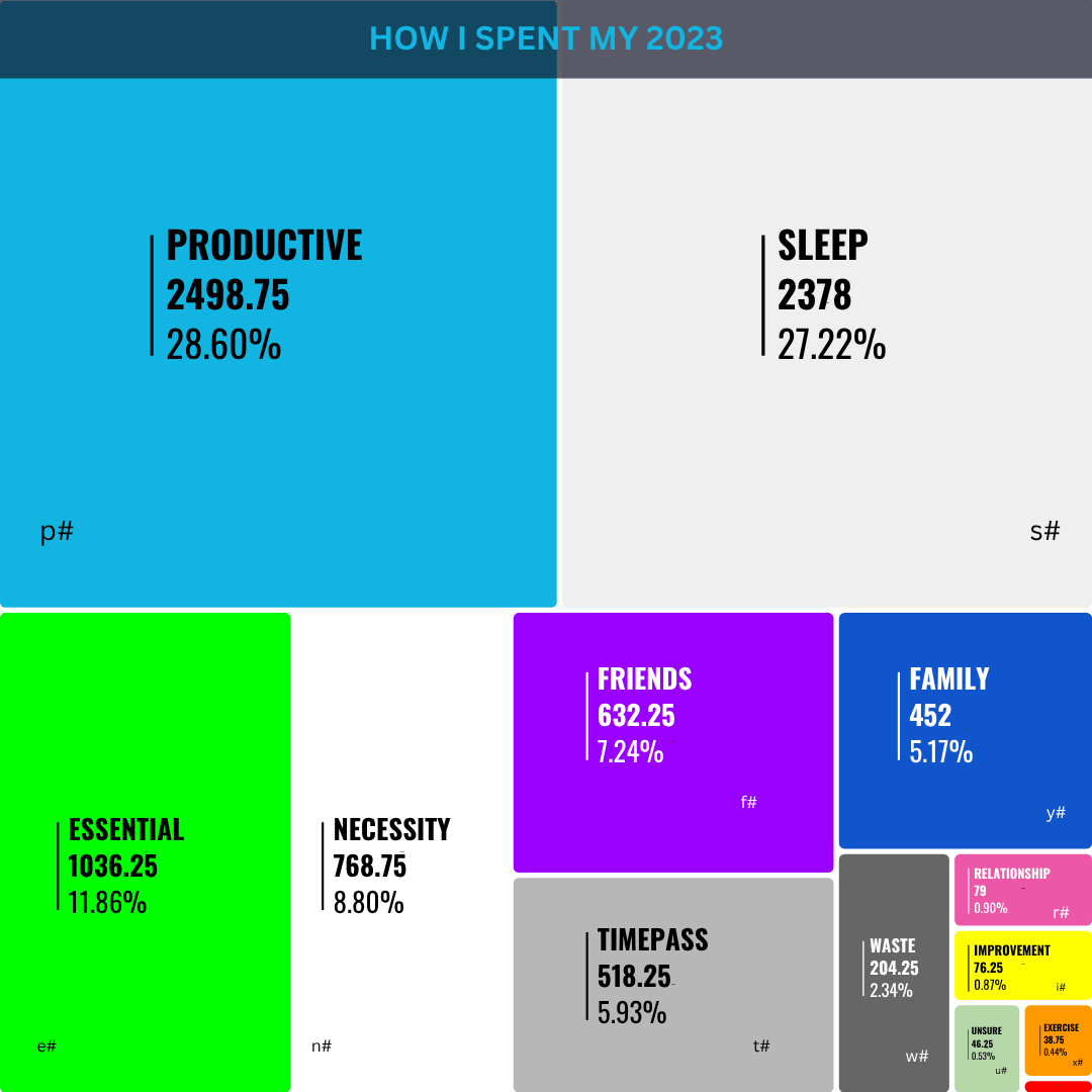 You only sleep about 6.5hrs a night? If I tracked myself, it would look so different. 33% sleep, 20% productive, and a frightening percent on some combination of time waste and leisure.