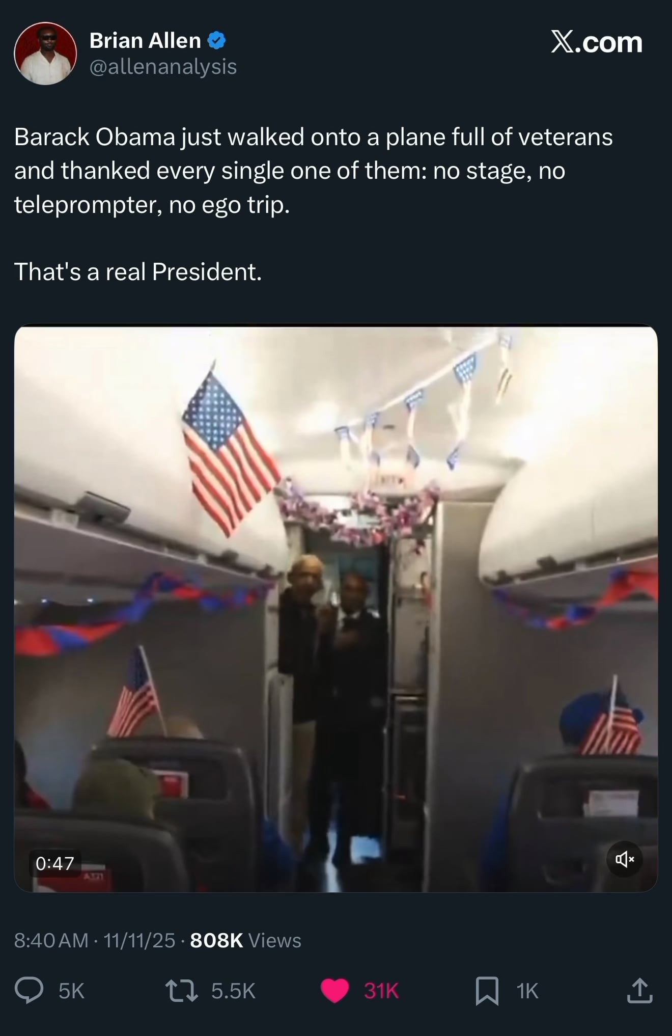 Man I forgot how it looks to have a president who actually acted like one. I’m sure not all of those vets were fans of his but they still gave him respect . I hope one day the position of the presidency will be respected again