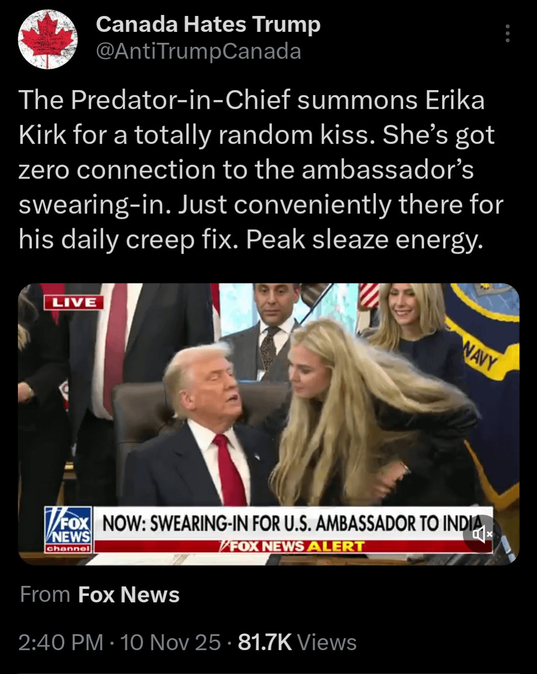 8. Well those of us who hated Charlie Kirk can at least say that his wife has done a wonderful job at disrespecting him and essentially humiliating him even after his death, by making it obvious to everyone in the world that she is doing the rounds with all the old men in the White House.