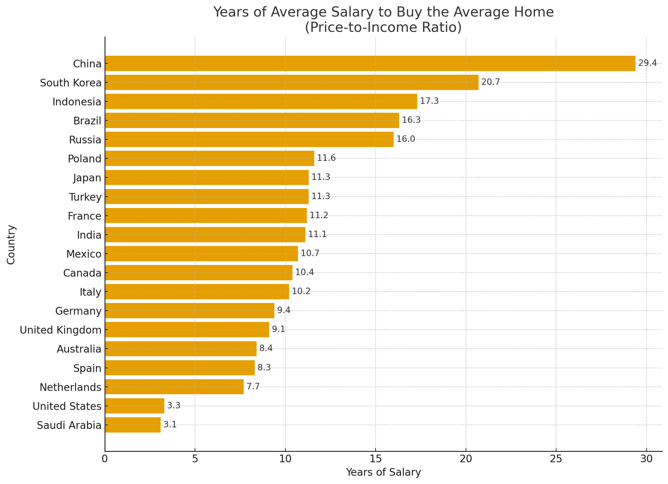 Here is a chart with data from https://worldpopulationreview.com/country-rankings/affordable-housing-by-country that shows the 20 biggest economies in the world ( from https://statisticstimes.com/economy/projected-world-gdp-ranking.php ) and see how many years of the average salary it takes to buy the average home.