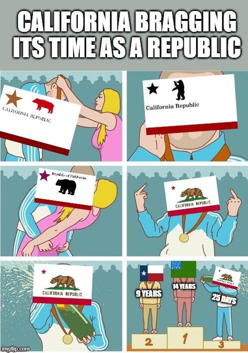 The Confederacy lasted longer than the California Republic. The F*cking Confederacy of all things!