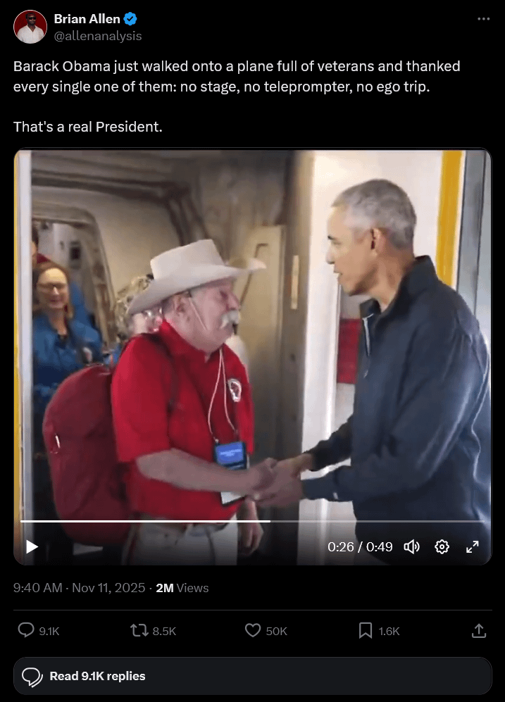 Barack Obama just walked onto a plane full of veterans and thanked every single one of them: no stage, no teleprompter, no ego trip.