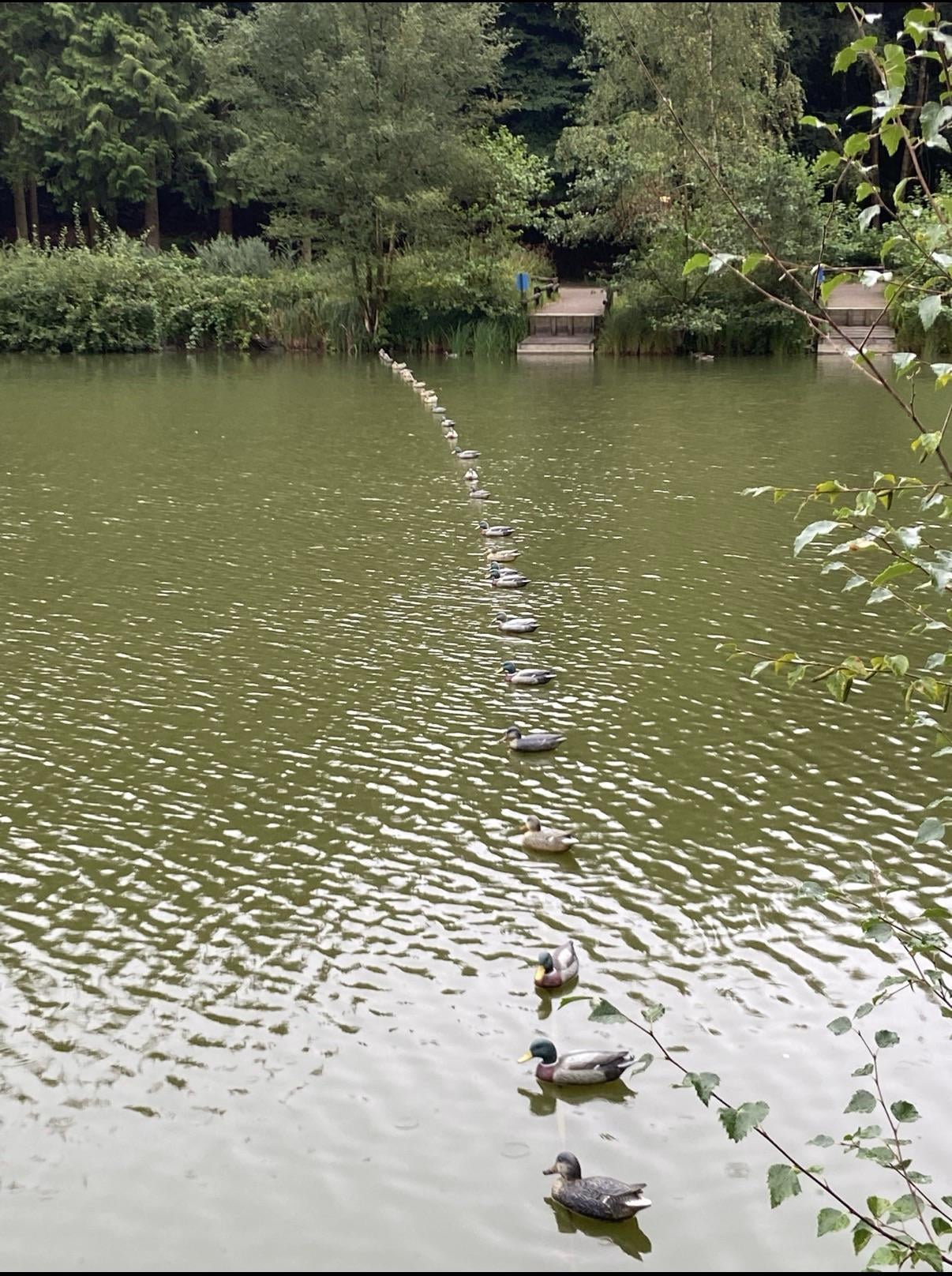 That is not ducks. That is decoys made from ether plastic or wood. But “Putting wooden decoys in a row” don’t have the same ring to it.