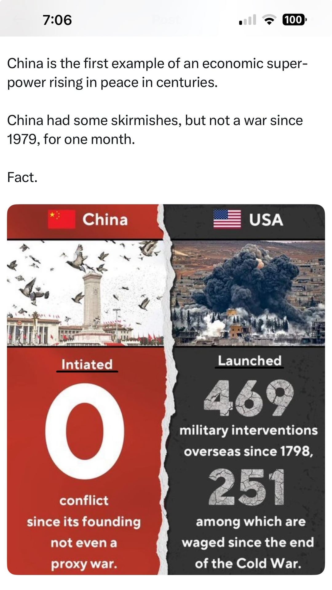 10. I mean, while China has definitely taken part in wars abroad, mostly initiated by them, it’s true that the amount pales in comparison to the US involvement internationally. It’s just funny to see comments going “oh so what about the uyghurs?”, like sure, that is true, but is the US of all countries in a position to criticise that…?