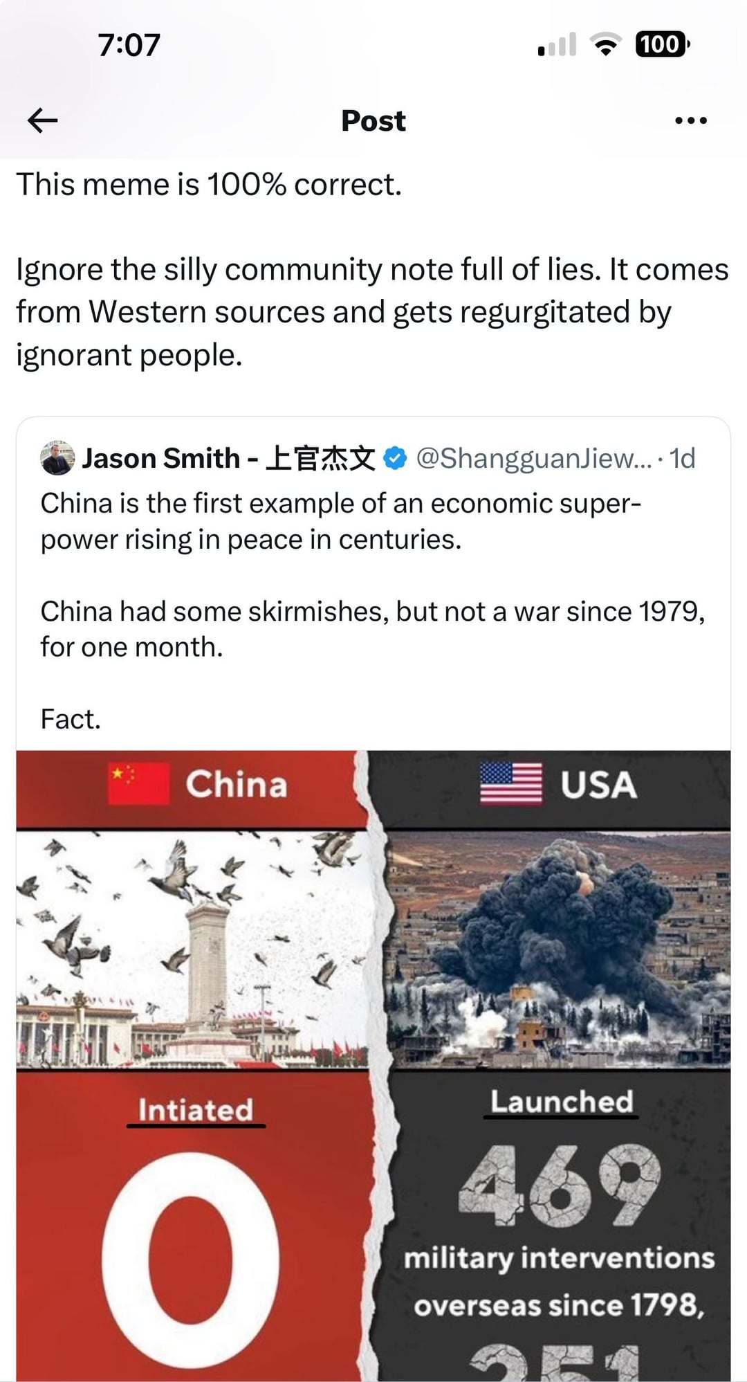 11. I mean, while China has definitely taken part in wars abroad, mostly initiated by them, it’s true that the amount pales in comparison to the US involvement internationally. It’s just funny to see comments going “oh so what about the uyghurs?”, like sure, that is true, but is the US of all countries in a position to criticise that…?