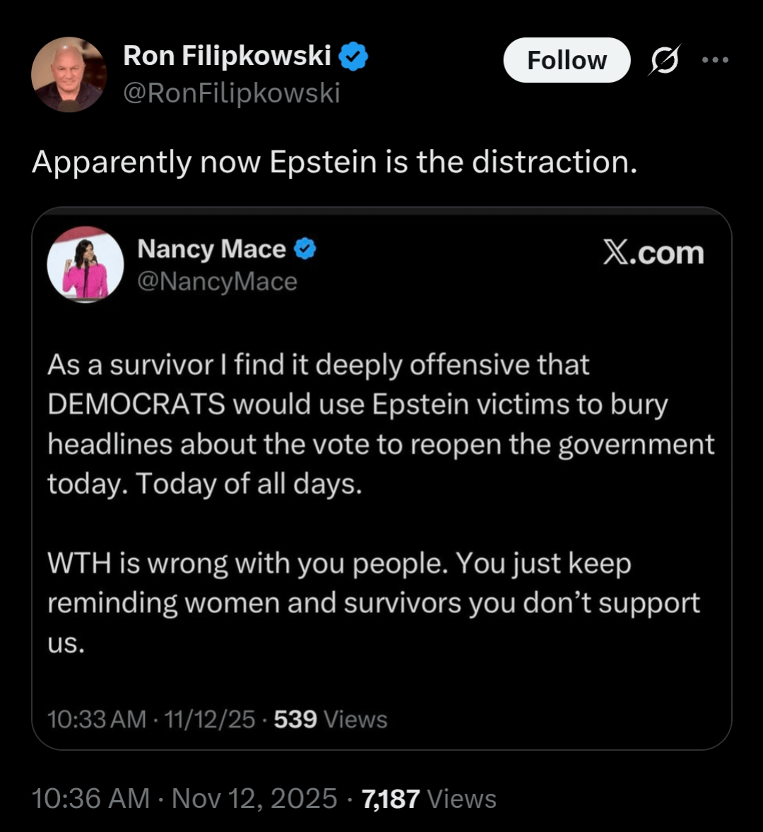 Mark my words, she’s going to pull her support of the discharge petition to vote on releasing the Epstein files. If it gets the 218 signature it’s too late. Mace will pull her signatures before the new Rep can sign on.