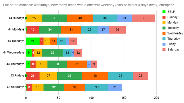 Then I wondered “Ok, if Tuesday is the best price most often, but still less than half, when ELSE is the best price?” That led to the rainbow graph, which other day of the week has a better price and how often? (he "SELF" bars are how many days that day-of-week was the cheapest within the +/- 3 days surrounding it) A bit of a surprise in that result: there are 12 Tuesdays where the previous Saturday is actually better (but not best)?