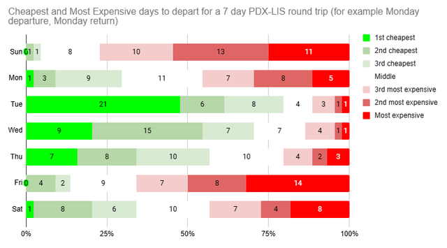I think we’ve all heard that it is cheaper to fly on some days than on other days. I have proof! I’m pricing far out in advance a 7 day vacation to Lisbon for my wife and I (by “7 days” I mean we could depart on a Monday and return the following Monday, for example). We are going to spend my Delta SkyMiles to pay for it, and we’re going to sit in the posh lay-flat seats up front. Those seats are very expensive but hey, I want to spoil her (while still finding the cheapest way to do that). On Delta’s website, you can look at pricing about 11 months out (as I type this on Nov 12 2025, the last departure date they’ll price is Oct 2 2026). The price fluctuates dramatically over the week, and I got to wondering: which individual departure day-of-week is best? That led to the red and green graph where it turns out, it is usually Tuesday, with Wednesday and Thursday right behind. In 21 weeks out of 44*, the Tuesday price is the best price, and in 14 other weeks it is either second or third best; only once is it worst and only 5 times is it in the worst 3. Friday and Sunday are NEVER the best price, and there is one random Monday with a best price (Jan 19) and one random Saturday (May 23)