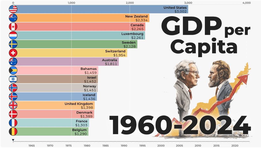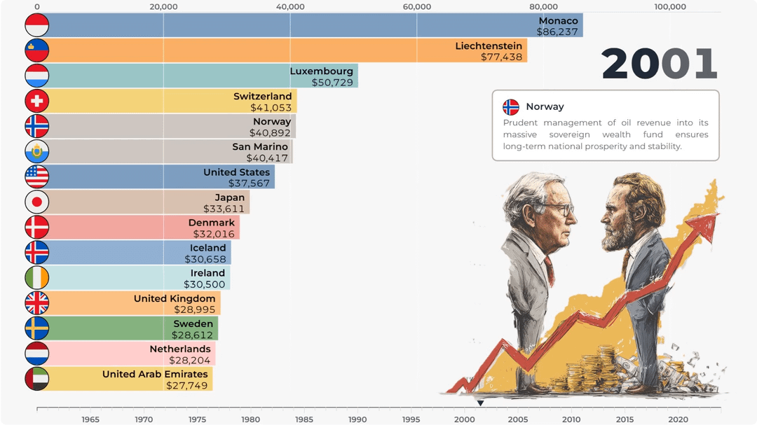 I've created an animated visualization showing 64 years of global wealth transformation. The animation reveals significant changes in country rankings, from oil boom stories to pandemic-era growth patterns.