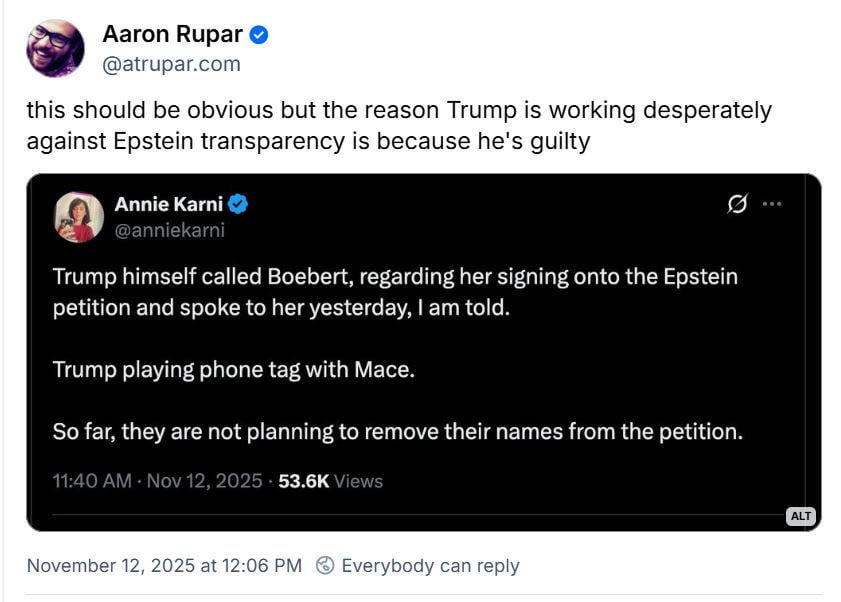 You know what I really don’t understand about all of this? We already know Trump was heavily involved with Epstein. We’ve known for literally years. They fight so hard against releasing this shit, but everyone literally already knows, and his followers simply either won’t believe it no matter what, or don’t care no matter what. The outcome of this will change literally nothing, unfortunately.