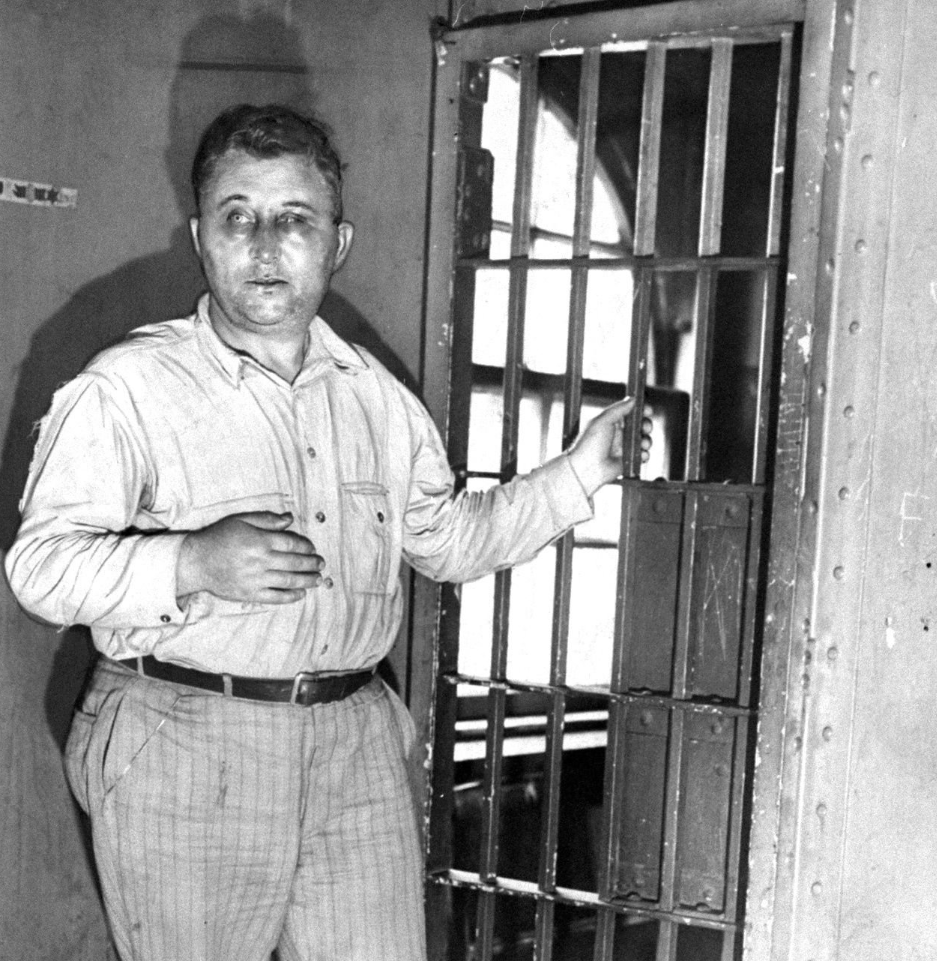 Harry Powers, the “Butcher of Clarksburg”, stands in jail after confessing to murdering five people, including a mother and her three children, ages 10 to 14, whom he strangled and beat to death. The police explained the bruises by claiming that Harry had “fallen up” some stairs, 1931 [937 x 961].
