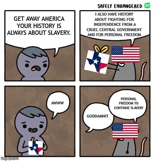 Impressive_Can8926 on November 13, 2025 4:28 am Context: depressingly can be applied to a lot of early US conflicts, but yes the Texas war of independence was in large part due to Mexico outlawing slavery. [https://www.texasmonthly.com/being-texan/how-leaders-texas-revolution-fought-preserve-slavery](https://www.texasmonthly.com/being-texan/how-leaders-texas-revolution-fought-preserve-slavery) [https://en.wikipedia.org/wiki/Texas_Revolution](https://en.wikipedia.org/wiki/Texas_Revolution) [https://www.neh.gov/humanities/2013/marchapril/statement/south-freedom](https://www.neh.gov/humanities/2013/marchapril/statement/south-freedom) EDIT: SOURCES WILL CONTINUE TO BE ADDED UNTIL MORAL IMPROVES [https://en.wikipedia.org/wiki/History_of_slavery_in_Texas](https://en.wikipedia.org/wiki/History_of_slavery_in_Texas) [https://www.zinnedproject.org/materials/the-counter-revolution-of-1836](https://www.zinnedproject.org/materials/the-counter-revolution-of-1836) [https://unlv-primo.hosted.exlibrisgroup.com/primo-explore/fulldisplay?vid=UNLV&tab=default_tab&docid=01UNLV_ALMA21180495190004081&lang=en_US&context=L](https://unlv-primo.hosted.exlibrisgroup.com/primo-explore/fulldisplay?vid=UNLV&tab=default_tab&docid=01UNLV_ALMA21180495190004081&lang=en_US&context=L) [https://books.google.ca/books/about/Bricks_Without_Straw.html?id=nXUOAQAAMAAJ&redir_esc=y](https://books.google.ca/books/about/Bricks_Without_Straw.html?id=nXUOAQAAMAAJ&redir_esc=y)