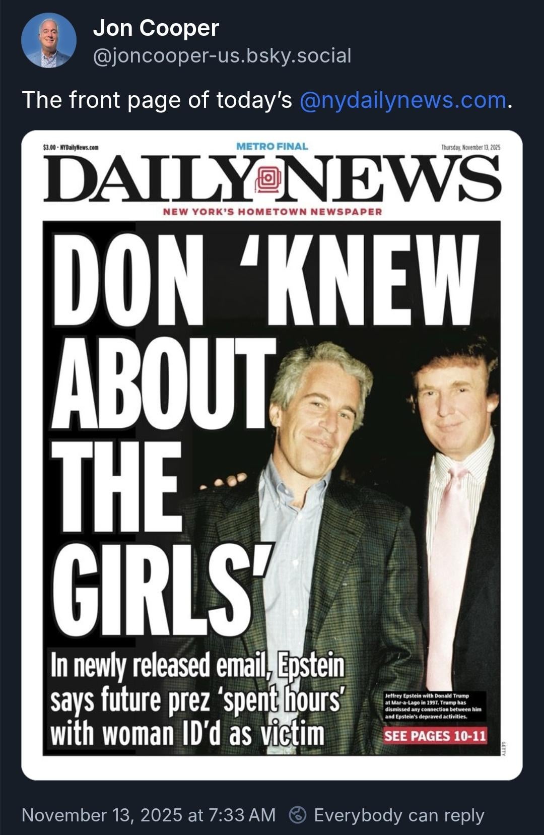 The whole world knows Donny is a pedophile and tangled up with Epstine. None of this is new, and the effects of delaying the proof will be evident by the manufacturer distractions such as accusing Clinton, Oboma, and Biden for crimes, bombing the mid-east, attacking parts of south America, and starving the American people.