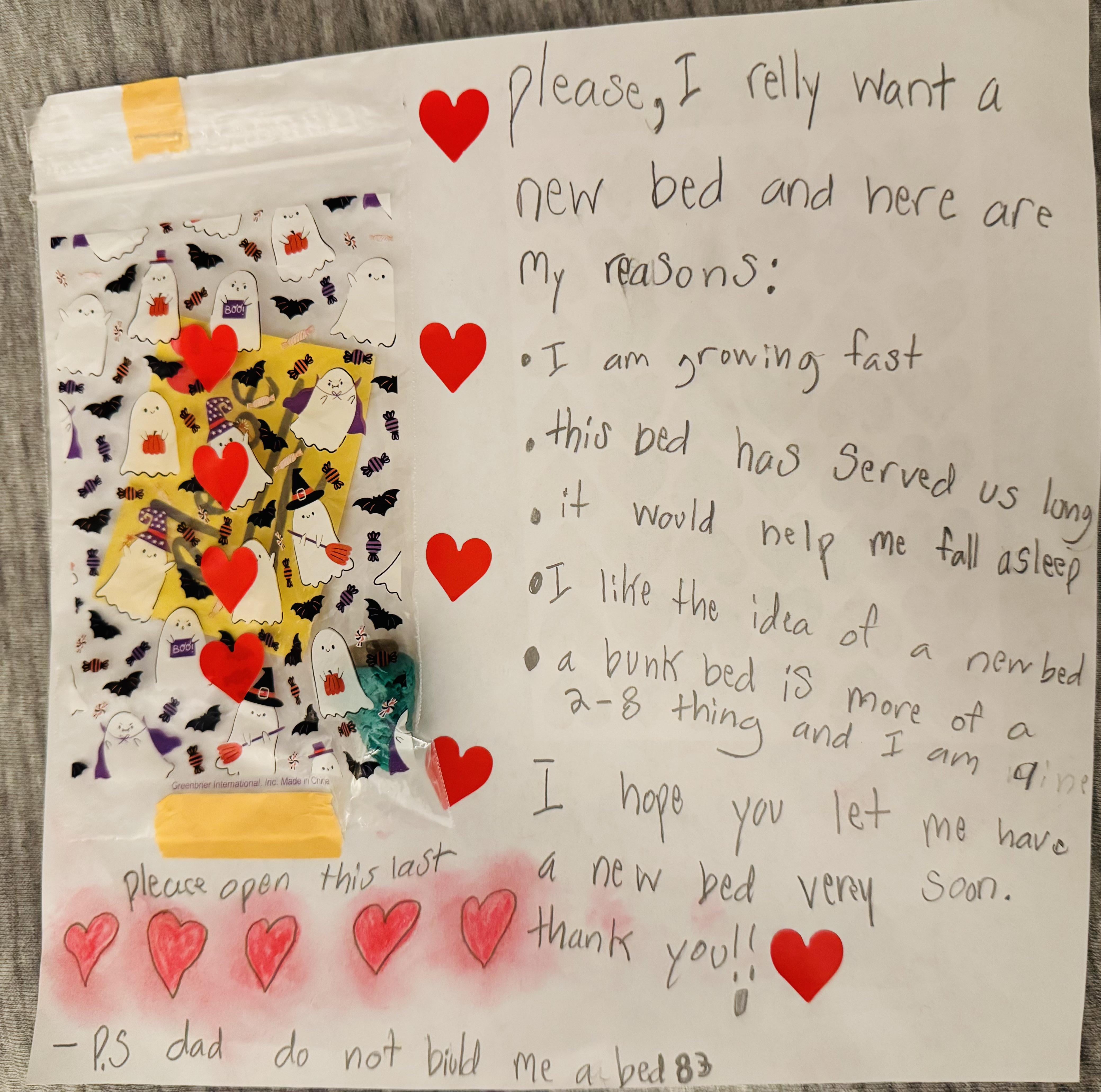 Sooo cute. I like how “bunk beds are more of a 2-8 thing and I’m 9.” Also is dad a terrible builder 😅? “I like the idea of a new bed” is a good reason too 💓