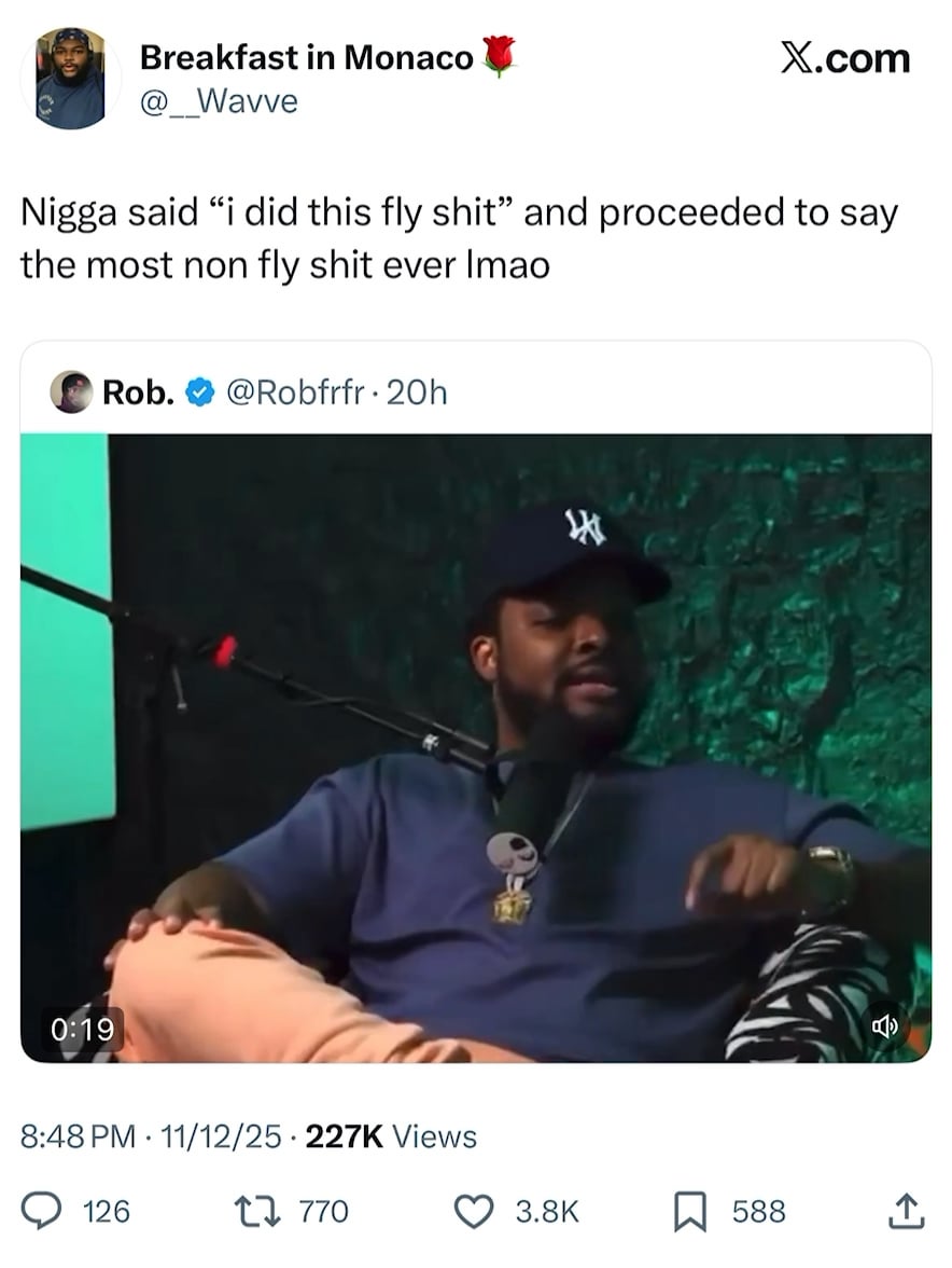 You know some fly shit I did? My homegirl went out of town to visit another guy so I paid for their hotel room and ordered em room service. Ain’t that fly shit?