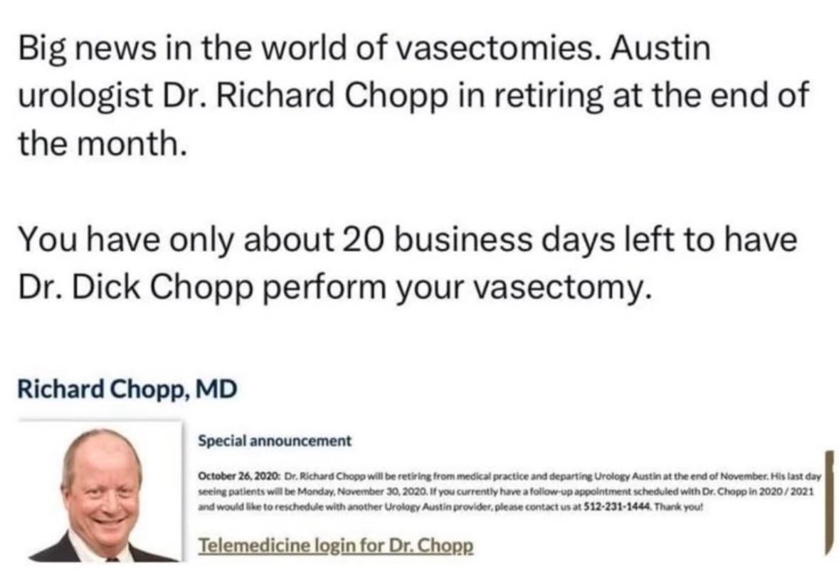 If you actually know what happens in a vasectomy, you wouldn’t want Dick Chopp….