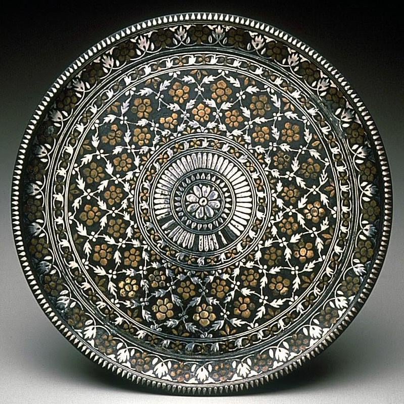 This plate displays the regularly spaced floral decoration typical of objects called Bidri ware, which were created through a complex casting, engraving, inlay, and chemical process. Although Bidri ware was manufactured in some northern Indian cities, the main production centers were, and still are, in south central India.
