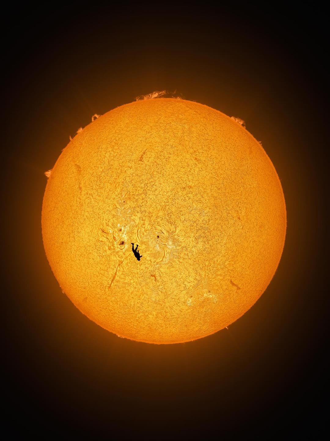 A perfectly timed silhouette: a skydiver captured crossing the face of the Sun for a split second. The shot was planned around the dive schedule and the Sun’s position, then taken through a solar telescope with protective filters to safely reveal sunspots and prominences. No, the jumper wasn’t anywhere near the Sun, it’s an alignment from Earth’s perspective that lasts fractions of a second