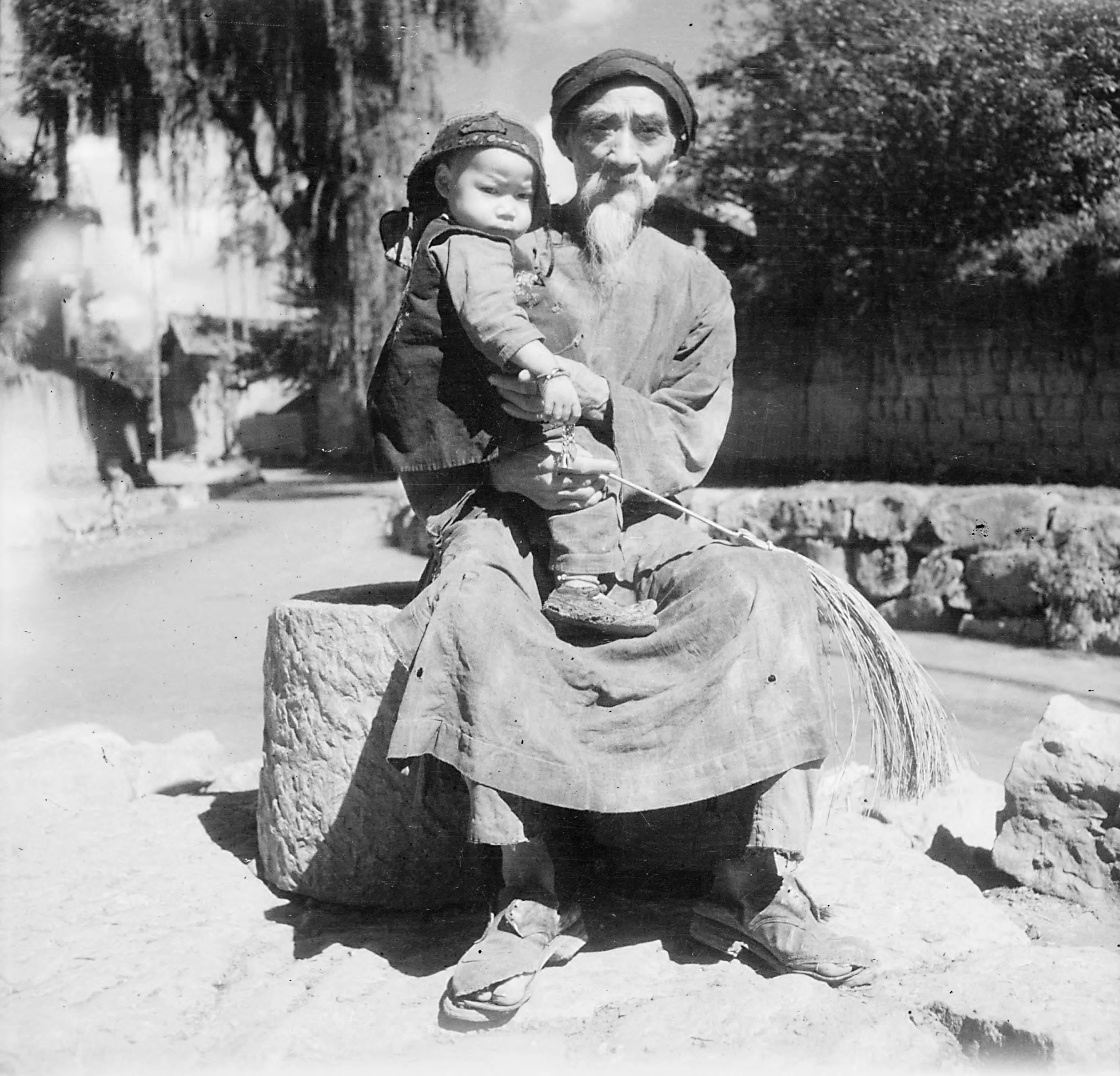 [Source](https://collections.lib.uwm.edu/digital/collection/agsphoto/id/7395/rec/136) says, “This elderly gentleman held his grandchild for all to see. He sits on the edge of the village well. What looks like a round stone is actually the opening to the local water supply. He holds a small broom used for keeping flies away. The child was dressed in colorful clothes. Note the grandfather’s worn shoes. He is entrusted with the child’s care since the parents are working in the fields. He projects an aura of pride and dignity.”
