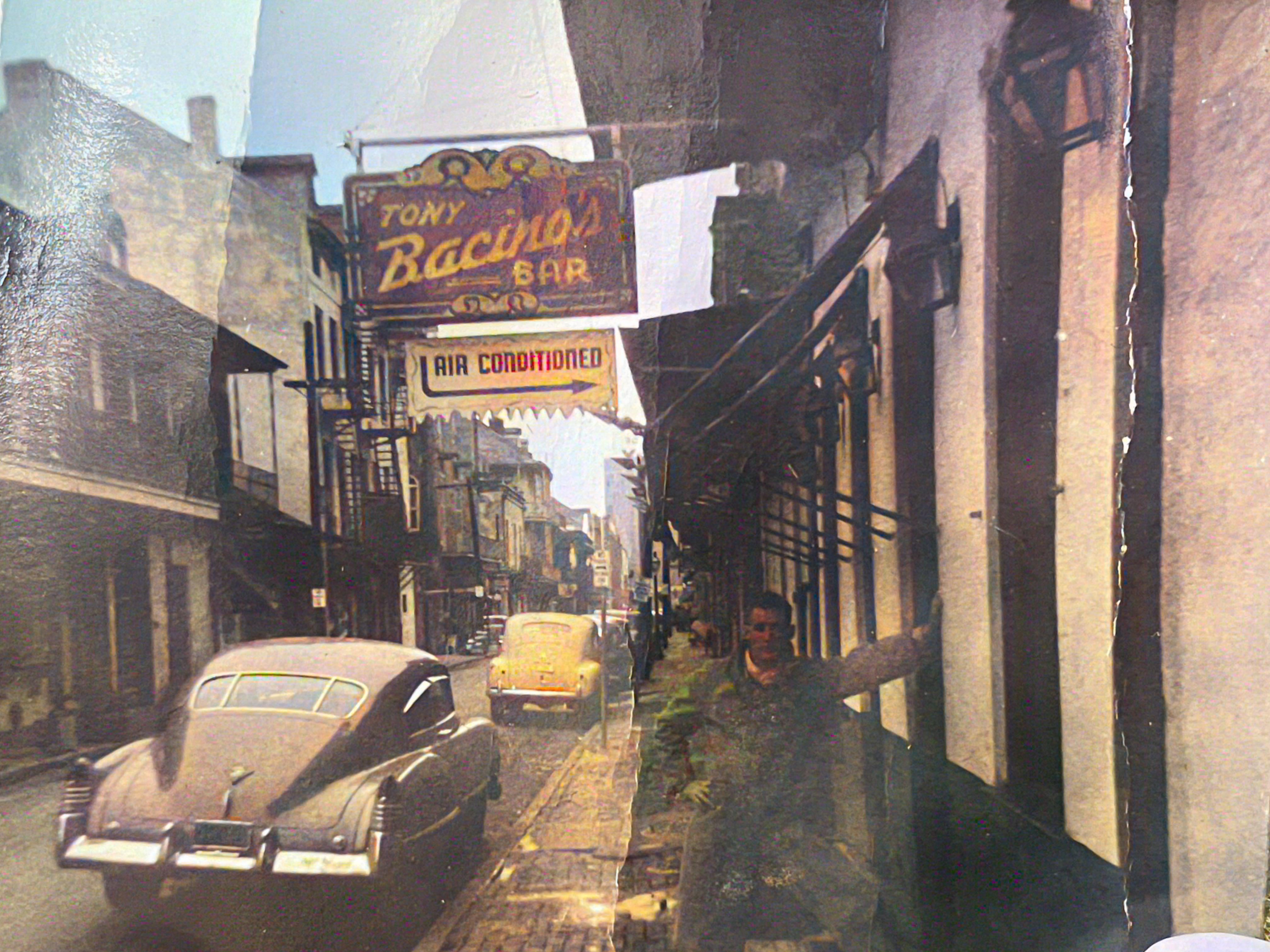 I think that’s a ‘48 fastback cadillac in the foreground, so at least 1948. Tony Bacinos bar opened in 1946 on Toulouse St and shut in 1954. So this pic was probably taken in that 8 year window.